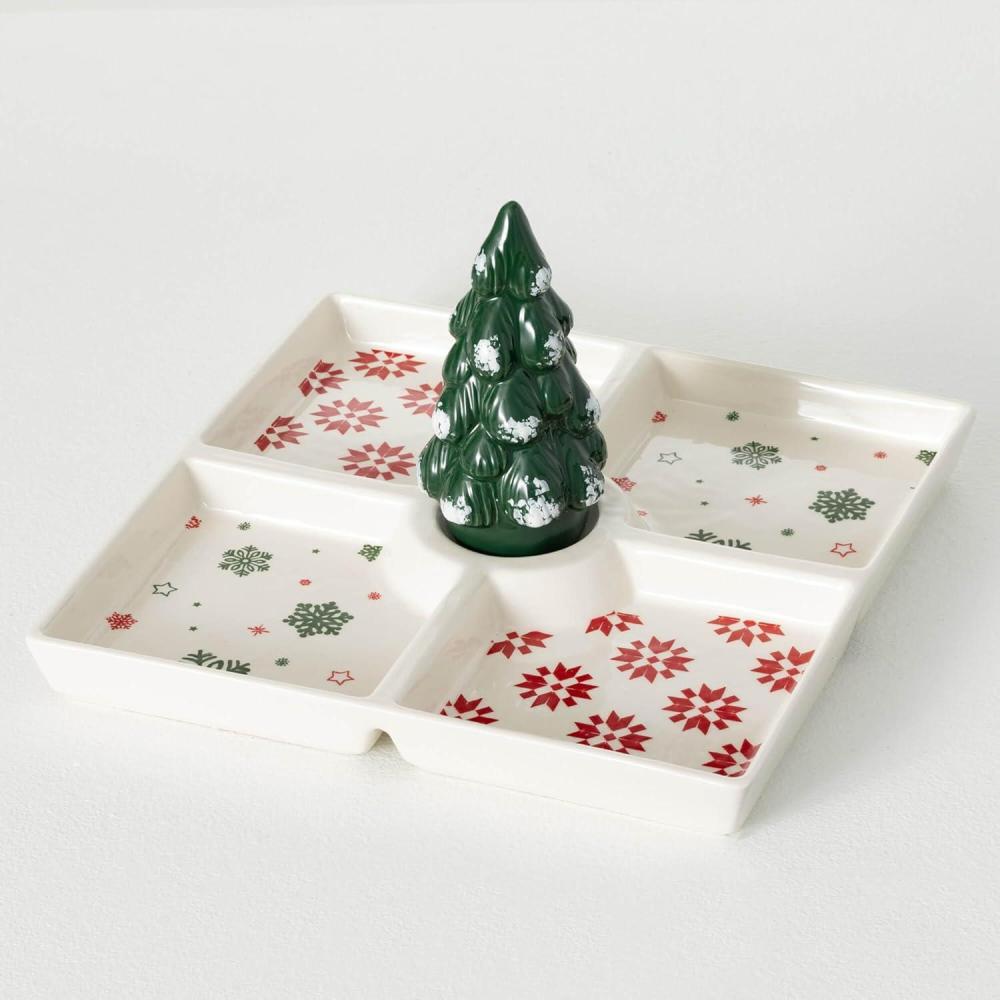 Celebrate the holiday season in style with the Sullivans Festive Christmas Tree 4 Section Server. This beautifully designed ceramic platter is not only functional but also full of holiday charm, making it the perfect addition to your Christmas tableware. The server's design features a nostalgic red and green snowflake and quilt pattern that invokes the warmth and comfort of a vintage holiday season. With dimensions of 12.5 inches long, 12.5 inches wide, and 8.5 inches high, this square platter provides ample space for a variety of festive treats. Its four divided sections make it ideal for neatly organizing and serving different types of nuts, candies, condiments, or traditional Christmas dishes. Whether you're hosting a large holiday dinner or a small family gathering, this server meets all your needs with style and ease. The server is crafted from dolomite, a durable ceramic material known for its excellent quality and longevity. This makes the platter not only beautiful but also robust enough to withstand the rigors of seasonal use, ensuring it can be enjoyed year after year. This Sullivans Festive Christmas Tree 4 Section Server is an exclusive item, adding a unique touch to your collection of holiday decor and serveware. It's not just a functional piece but also a decorative one that enhances your holiday decor with its festive design. Whether used for serving or as a part of your holiday centerpiece, this server is sure to impress guests and add to the joyous atmosphere of your celebrations. Overall, this server is a must-have for anyone looking to add a touch of vintage charm and functional elegance to their holiday gatherings. Its versatile design and durable construction make it a valuable addition to any holiday table setting, perfect for creating memorable and festive moments with loved ones.