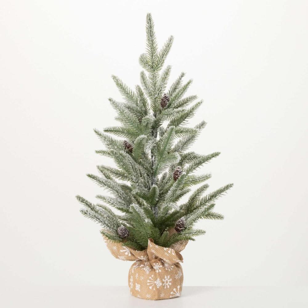 Festive Winter Decor: Elevate your Christmas decor with the Sullivans Artificial Flocked Pine Tree, standing at 25.5 inches tall and beautifully nestled in a festive winter burlap sack.